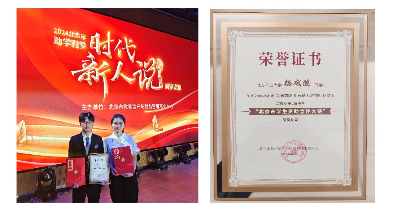 杨成俊同学表现优异,获评2024年北京市“学生资助宣传大使”。同时,杨成俊同学与建筑与艺术学院彭祥敏同学入选“北京市学生资助宣讲团”。