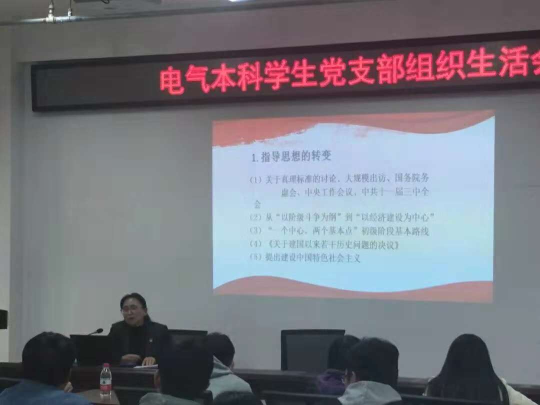 2018年11月29日下午,电气本科学生党支部组织生活会在博远楼452教室召开。学院党委书记李颖宏到电气本科学生党支部讲党课,电气本科学生第一党支部书记曹靖、第二党支部书记吴力普,支部党员和积极分子参加。