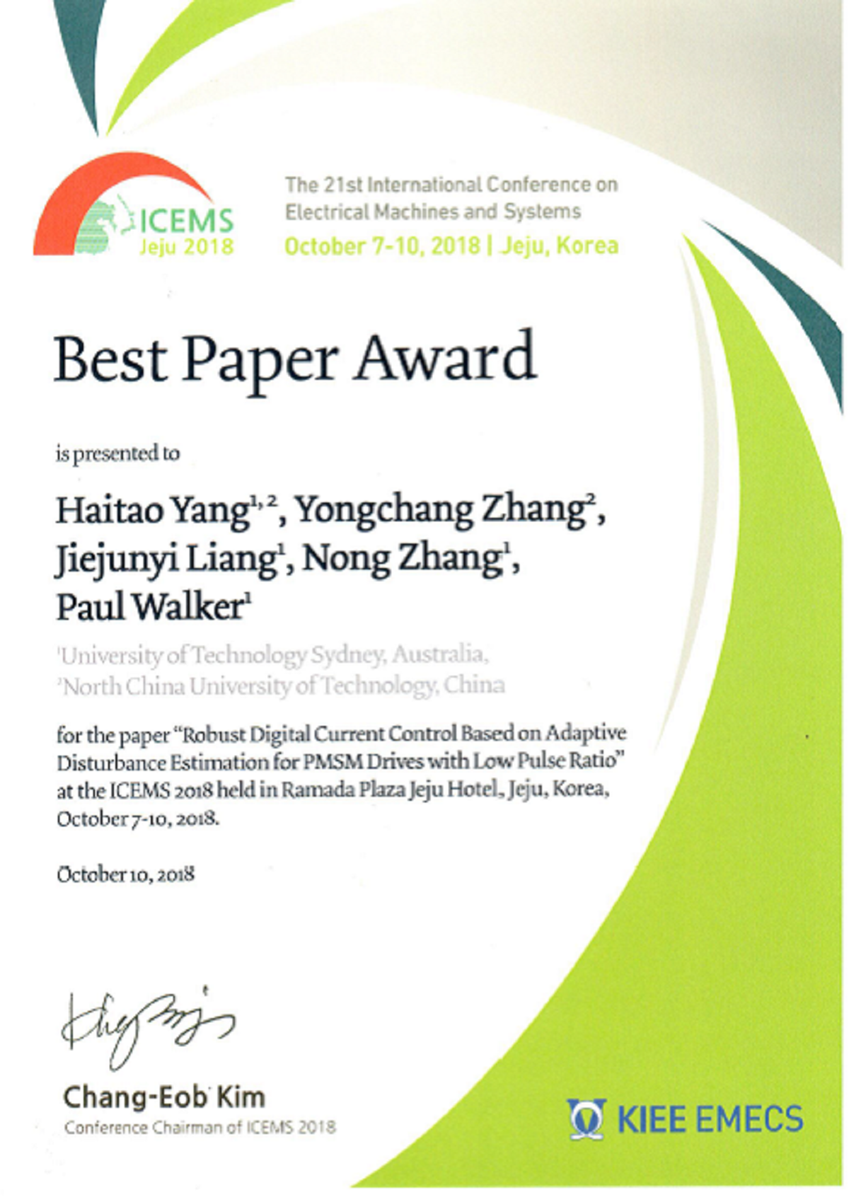 电气工程研究院师生完成的论文获得3篇最佳论文奖(Best Paper Award),这是继2013年电控师生在ICEMS会议上获奖后再次获奖。