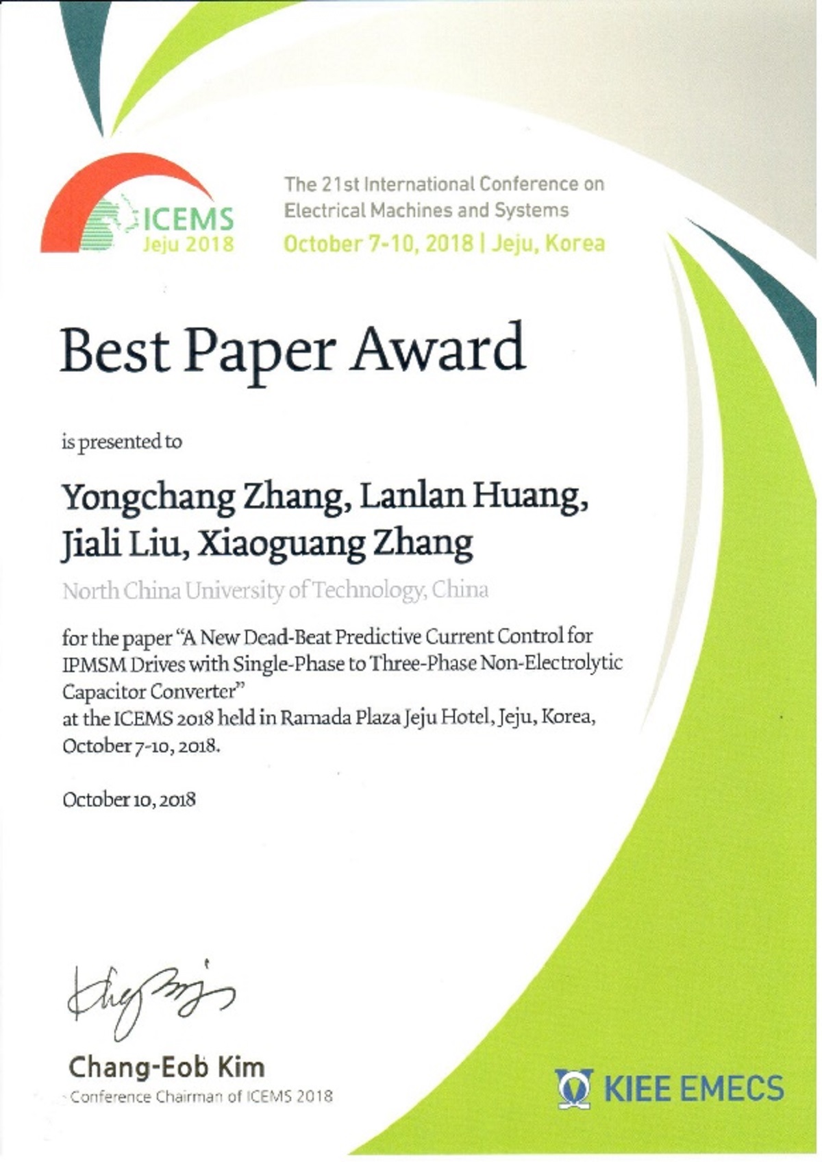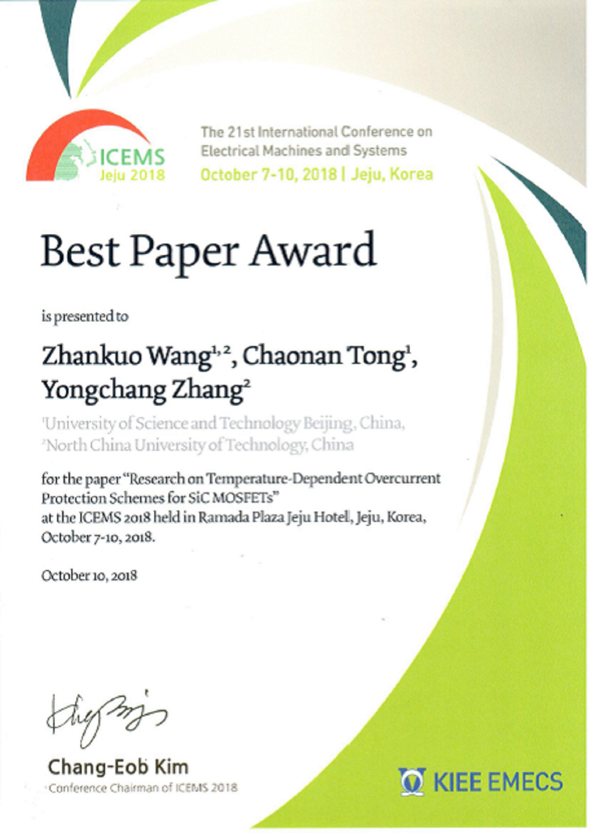 在本次会议上共发表论文15篇,参会14人。3篇获奖论文为:张永昌、黄兰兰、刘家利和张晓光完成的论文《A New Dead-Beat Predictive Current Control For IPMSM Drives With Single-Phase To Three-Phase Non-Electrolytic Capacitor Converter》;王占扩、童朝南、张永昌完成的论文《Research on Temperature-Dependent Overcurrent Protection Schemes for SiC MOSF ETs》;杨海涛、张永昌等完成的论文《Robust Digital Current Control Based on Adaptive Disturbance Estimation for PMSM Drives with Low Pulse ratio》(杨海涛为擦边短剧