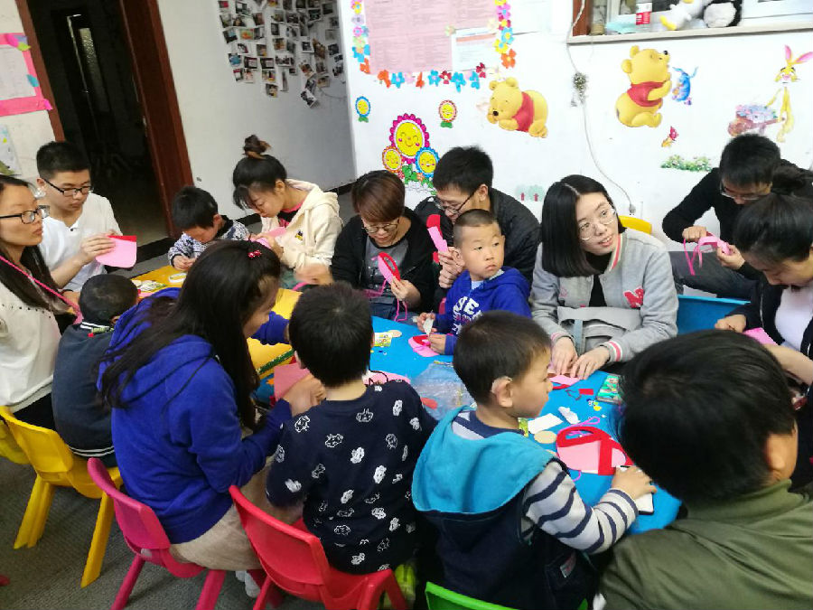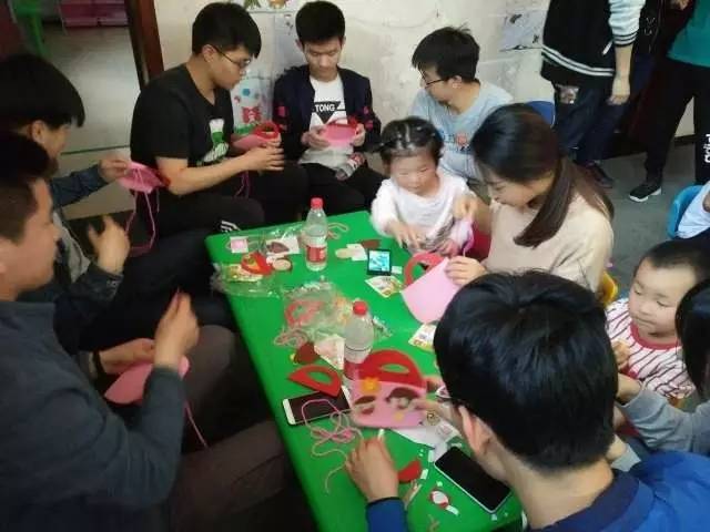 支部同学的到来得到了康复中心的老师的热烈欢迎。她们表示,让孩子们多与外界接触对他们的康复有很大的帮助。活动开始之前,同学们和孩子们简单地进行了交流,消除了他们的陌生感。随后,对场地进行了打扫和整理,然后按照小组开展了帮助小朋友做卡通手提袋的活动。