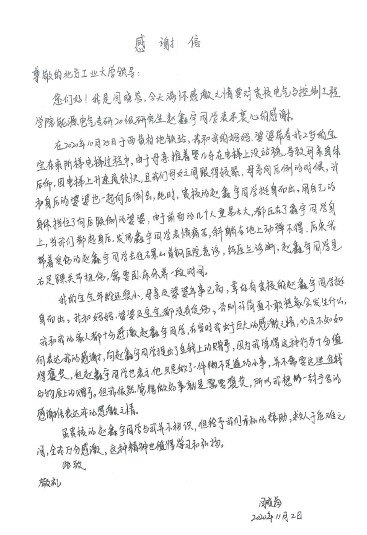10月25日,西黄村地铁站内,闫女士的妈妈在推着婴儿车乘坐扶梯时,由于重心不稳,加之扶梯速度较快,导致身体后倾,并连带紧跟身后的闫女士和闫女士的婆婆一同跌倒。而此时赵鑫宇同学挺身而出,用自己的身体挡住了向后跌倒的三人。但因为三个人重量过大,造成赵鑫宇同学右足踝关节扭伤。闫女士事后回忆到,她的宝宝年龄还很小,母亲和婆婆年事已高,幸好赵鑫宇同学挺身而出,她和妈妈、婆婆及婴儿都没有受伤。闫女士及其家人对于赵鑫宇同学的行为非常感激,并希望能给予其酬谢,“我仅仅做了一件微不足道的小事。”赵鑫宇同学这样回答,婉拒了闫女士的感谢金。赵鑫宇同学现为能源动力专研20级团支书,他返校后并没有向任何人提及此事。直到闫女士亲手写了一封感谢信送到学校,学校老师才获悉他舍己救人的事迹。