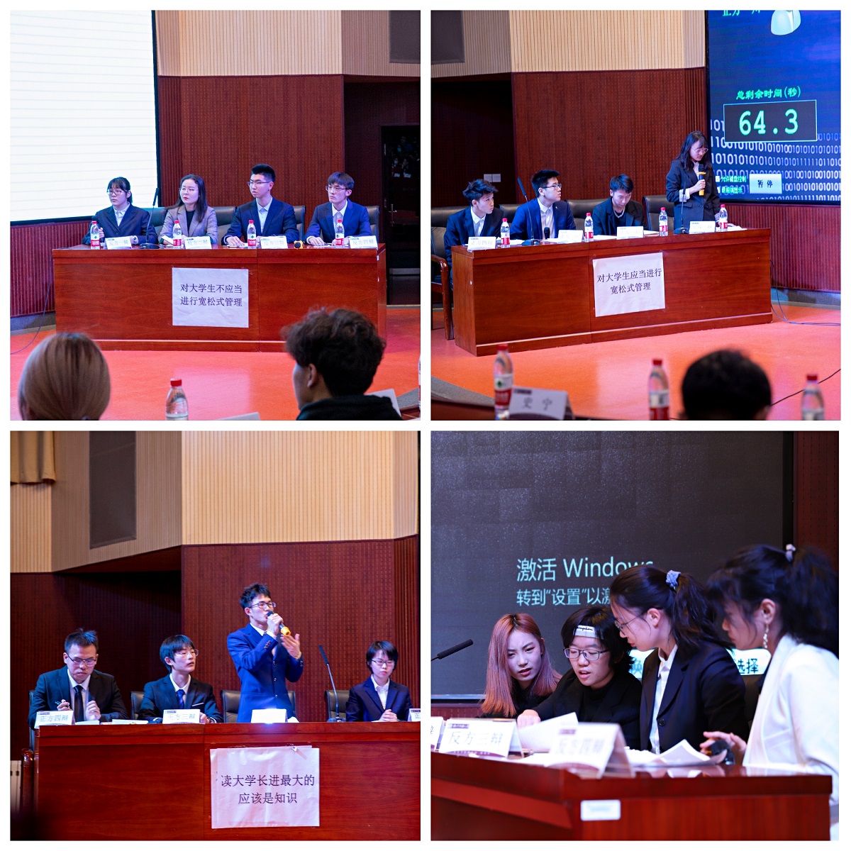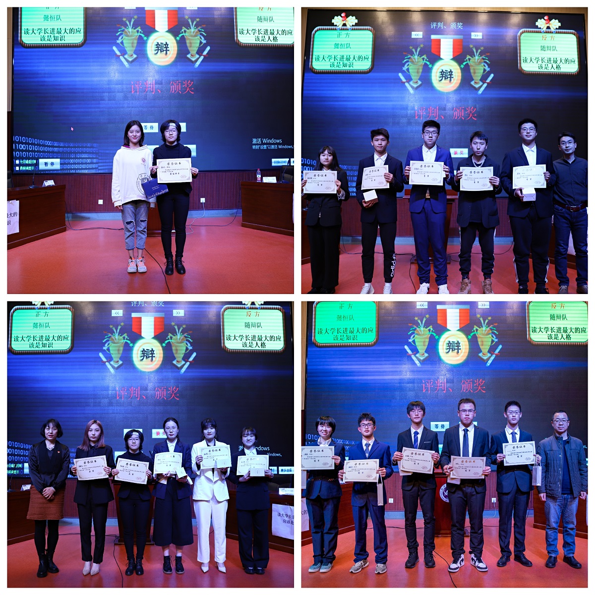辅导员库颖老师、学校辩论社社长冯嫄、学校艺术团团长江泠睿、学校主持人队队长于睿泽担任辩论赛评委,近200名学生到场观看。