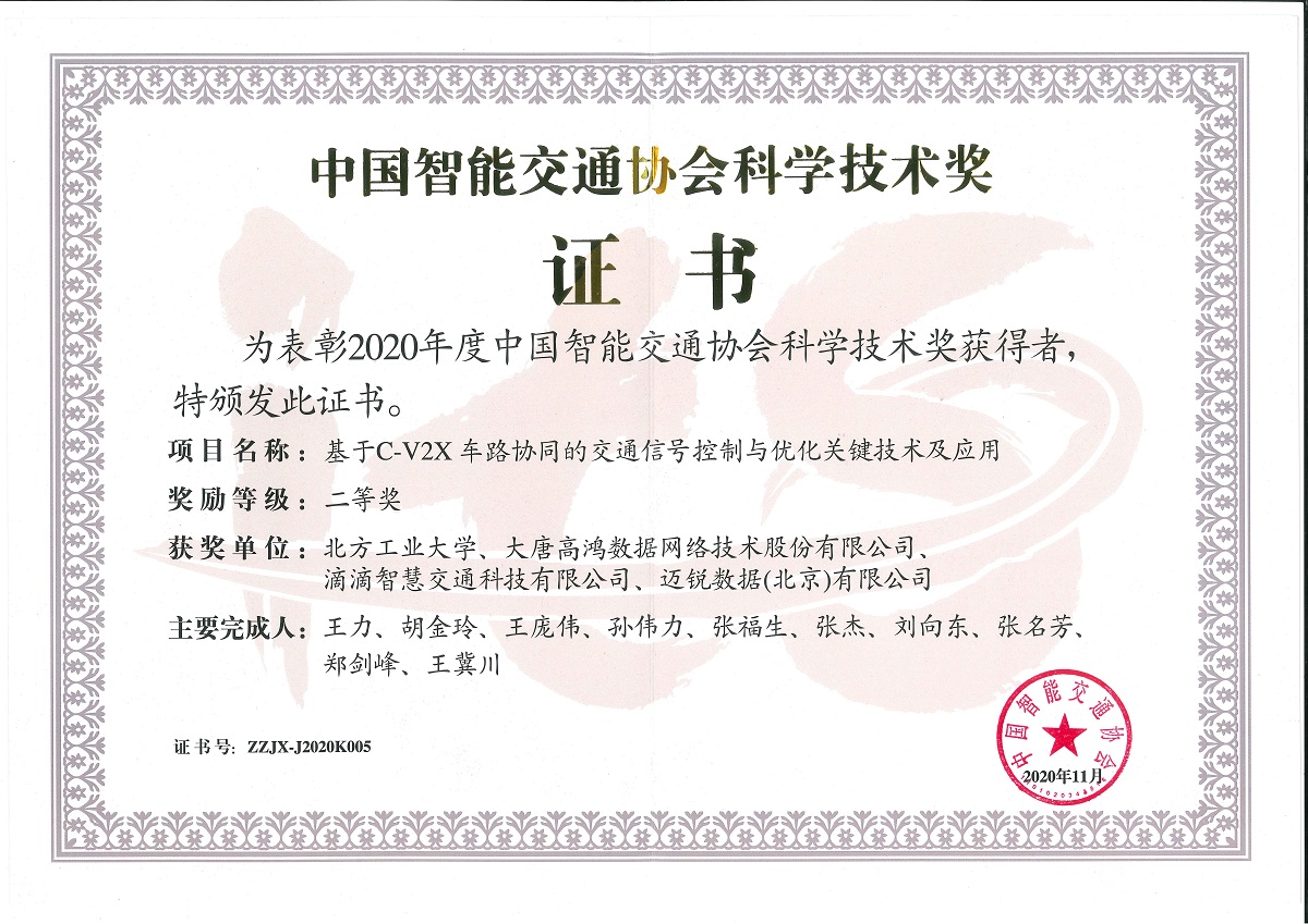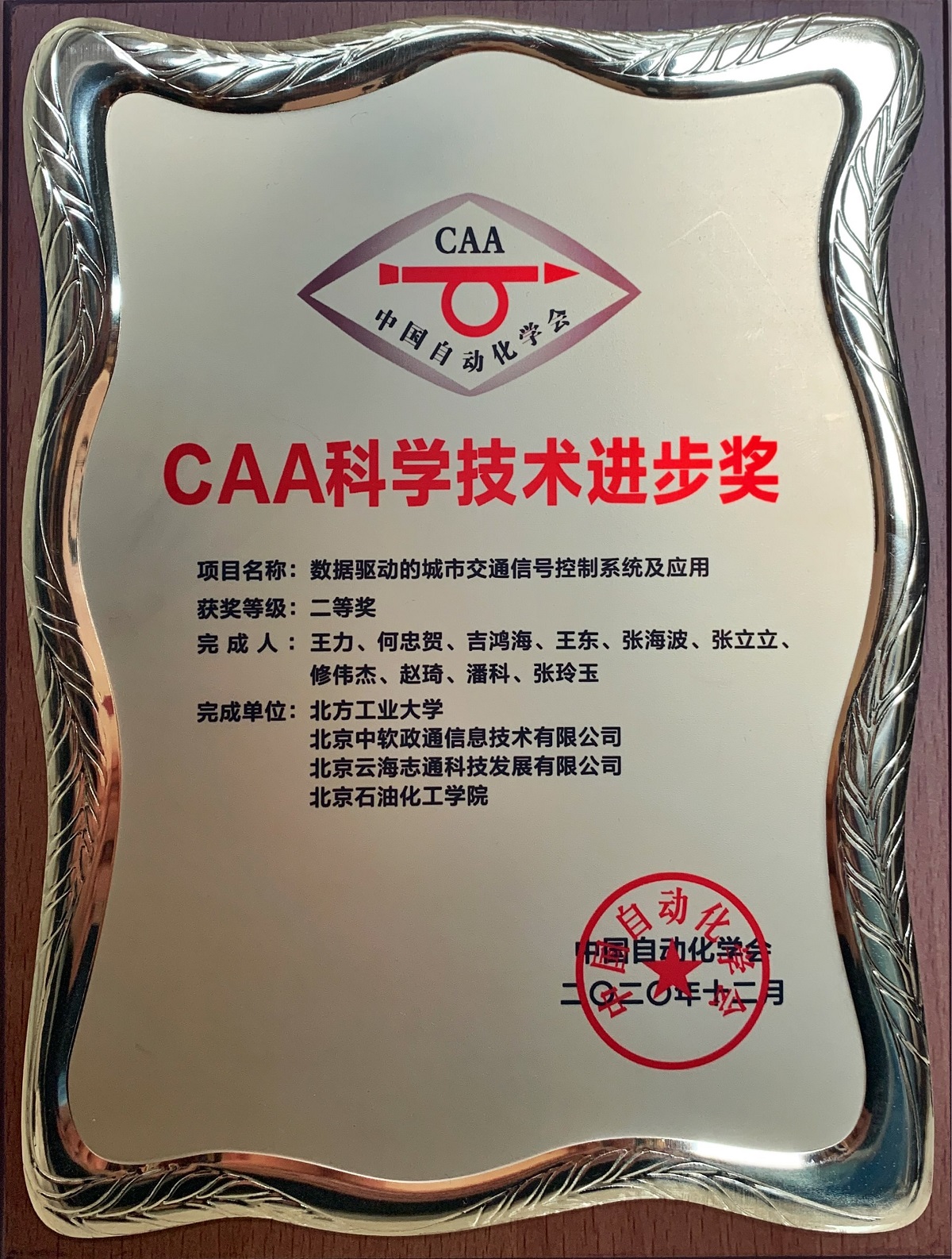 作为第一完成单位、王力教授、何忠贺副教授等牵头申报的“数据驱动的城市交通信号控制系统及应用”成果荣获2020年度中国自动化学会科学技术进步二等奖。该项目面向智能驾驶对交通控制系统与装备的新需求,提出了基于CPS架构的交通控制系统设计与优化理论方法与技术并在北京、潍坊等地应用,社会经济效益显著。