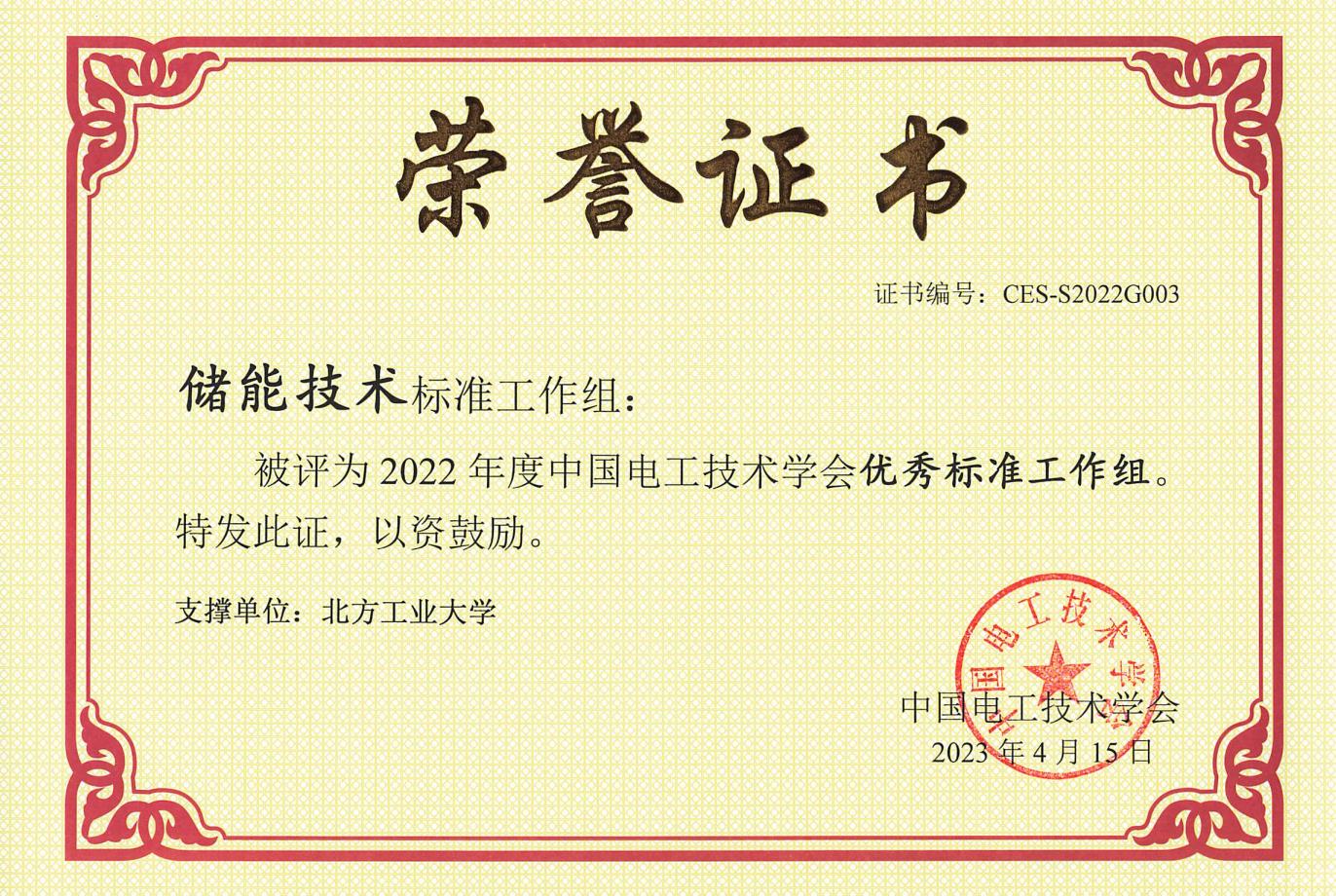 作为中国电工技术学会储能技术标准专业分会支撑单位,喜获“2022年度中国电工技术学会优秀标准工作组”。