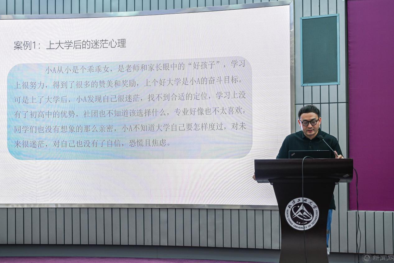 田儒基老师对学生心理健康教育工作方面进行介绍。他讲到,初入大学的孩子们正处于世界观、人生观、价值观建立的重要阶段,容易产生各种各样的心理问题。擦边短剧