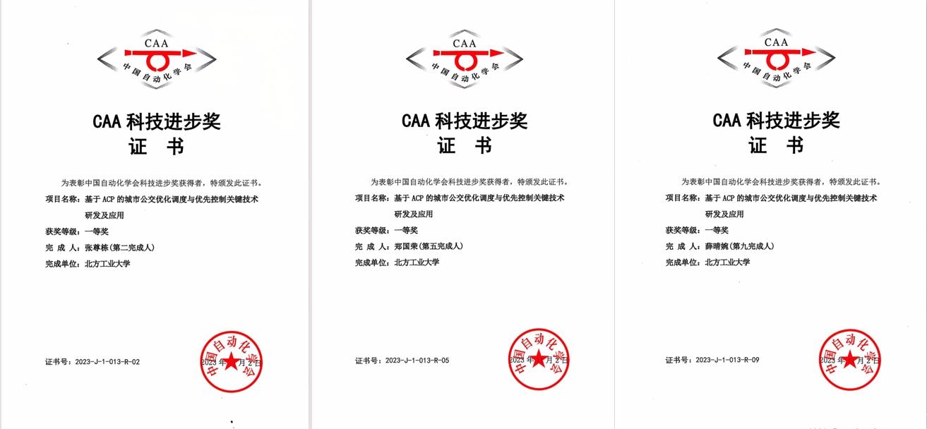 智能交通团队张尊栋、郑国荣、薛晴婉老师参与申报的“基于ACP的城市公交优化调度与优先控制关键技术研发及应用”成果荣获2023年度中国自动化学会科技进步奖一等奖。