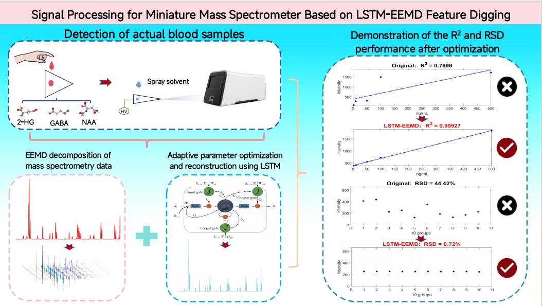 李明研究员在国际顶级期刊《Talanta》(中科院一区、TOP期刊)发表题为“Signal Processing for Miniature Mass Spectrometer Based on LSTM-EEMD Feature Digging”的研究论文。该研究创造性地提出了一种基于长短期记忆-集合经验模态分解(LSTM-EEMD)的数据处理方法,为提高小型质谱仪在复杂基质样品和恶劣环境条件下的现场检测性能开辟了新路径。