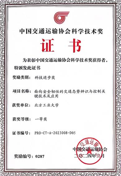 智能交通团队的成果“面向安全韧性的交通态势辨识与控制关键技术及应用”获评科技进步一等奖。团队长期致力于解决以北京特大城市为对象的城市道路交通智能控制问题,在城市交通信号控制系统的理论研究、技术创新、工程应用等方面形成了鲜明的科研特色。