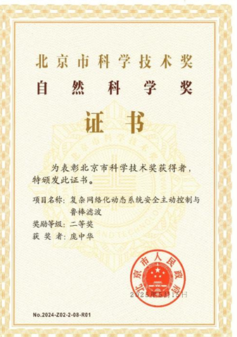 作为第一完成单位,庞中华教授为第一完成人的项目“复杂网络化动态系统安全主动控制与鲁棒滤波”,获得“自然科学奖”二等奖。胡长斌教授参与完成的项目“保障超大城市用电安全的需求侧资源灵活调节关键技术及工程应用”,获得“科学技术进步奖”二等奖。