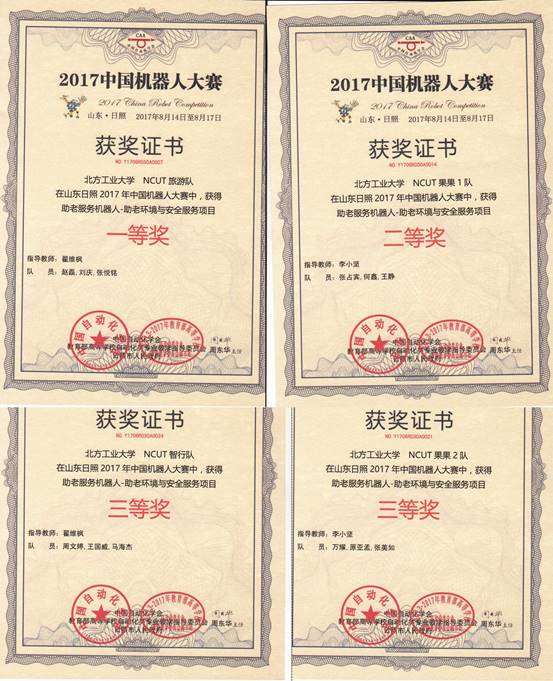 学生使用该机器人平台于2017年8月组织多个队伍参加了在山东日照举行的“中国机器人大赛”,在“助老服务机器人—助老环境与安全服务”分赛项中出色的完成了各项要求,最终获得一等奖一项、二等奖一项、三等奖两项的优异成绩。