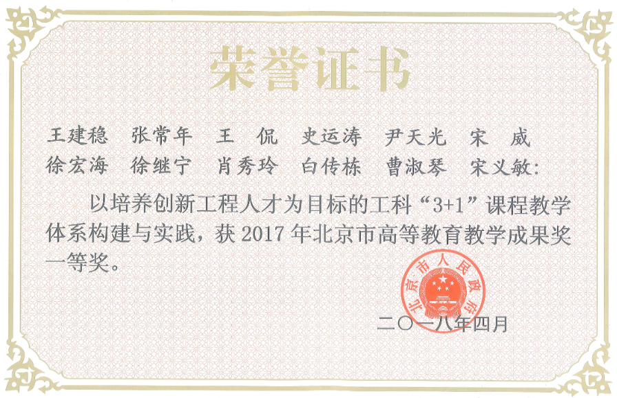 (5)王建稳 张常年 王侃 史运涛 尹天光 宋威 徐宏海 徐继宁 肖秀玲 白传栋 曹淑琴 宋义敏“以培养创新工程人才为目标的工科“3+1”课程教学体系构建与实践”获2017年北京市高等教育教学成果奖一等奖。
