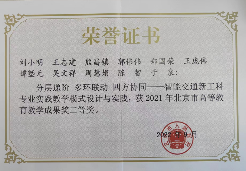 (4)刘小明 王志建 熊昌镇 郭伟伟 郑国荣 王庞伟 谭墍元 吴文祥 周慧娟 陈智 于泉 “分层递阶 多环联动 四方协同——智能交通新工科专业实践教学模式设计与实践”获2021年北京市高等教育教学成果奖二等奖。