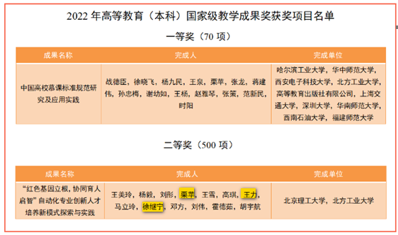(3)栗萍 王力 徐继宁 与北京理工大学共同完成,““红色基因立根、协同育人启智”自动化专业创新人才培养新模式探索与实践”获2022年高等教育(本科)国家级教学成果奖二等奖。