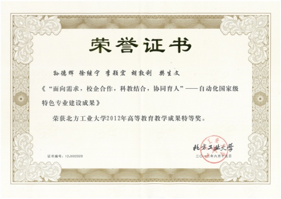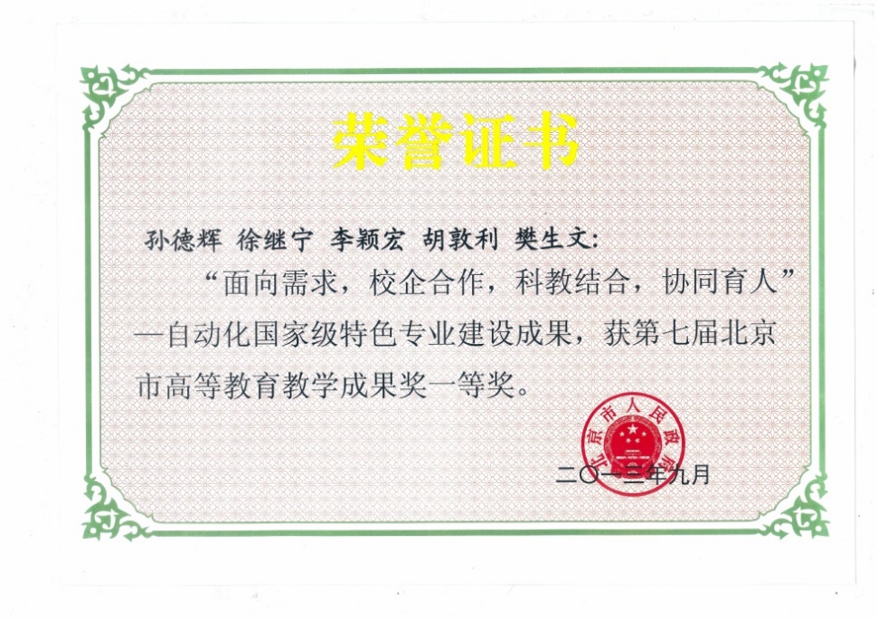 (6)孙德辉 徐继宁 李颖宏 胡敦利 樊生文“面向需求,校企合作,科教结合,协同育人—自动化国家级特色专业建设成果”获2013年北京市高等教育教学成果一等奖。
