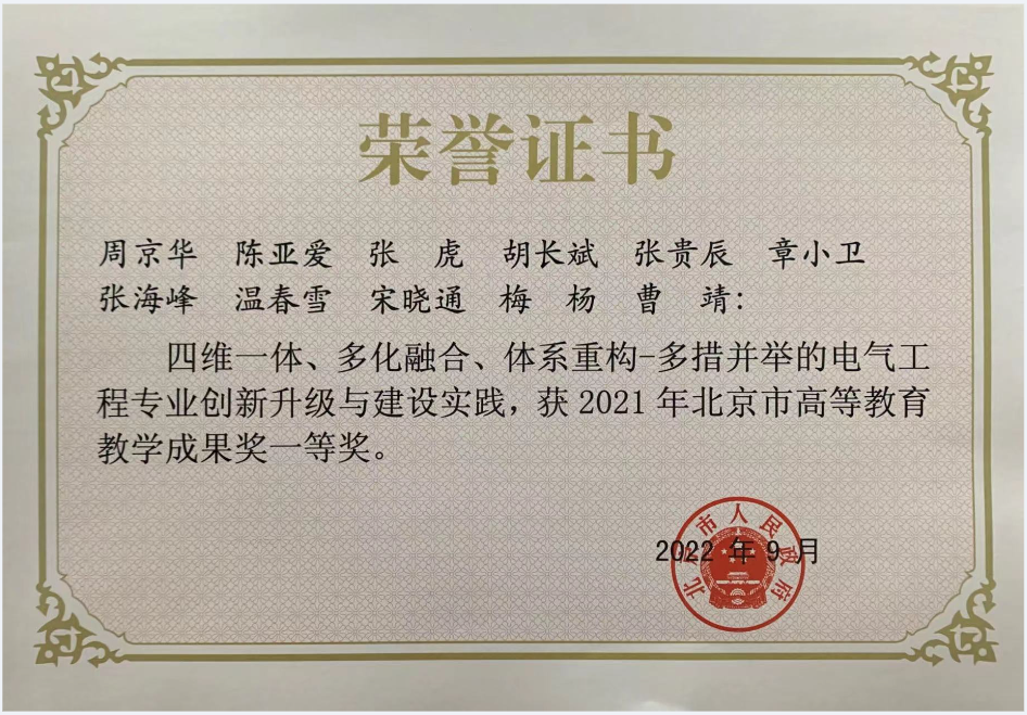 (1)周京华 陈亚爱 张虎 胡长斌 张贵辰 章小卫 张海峰 温春雪 宋晓通 梅杨 曹靖 “四维一体、多化融合、体系重构-多措并举的电气工程专业创新升级与建设实践”获2021年北京市高等教育教学成果奖一等奖。