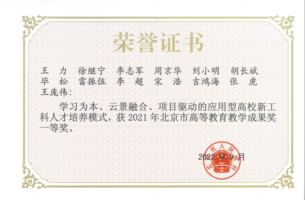 (2)王力 徐继宁 李志军 周京华 刘小明 胡长斌 毕松 雷振伍 李超 宋浩 吉鸿海 张虎 王庞伟 “学习为本、云景融合、项目驱动的应用型高校新工科人才培养模式” 获2021年北京市高等教育教学成果奖一等奖。