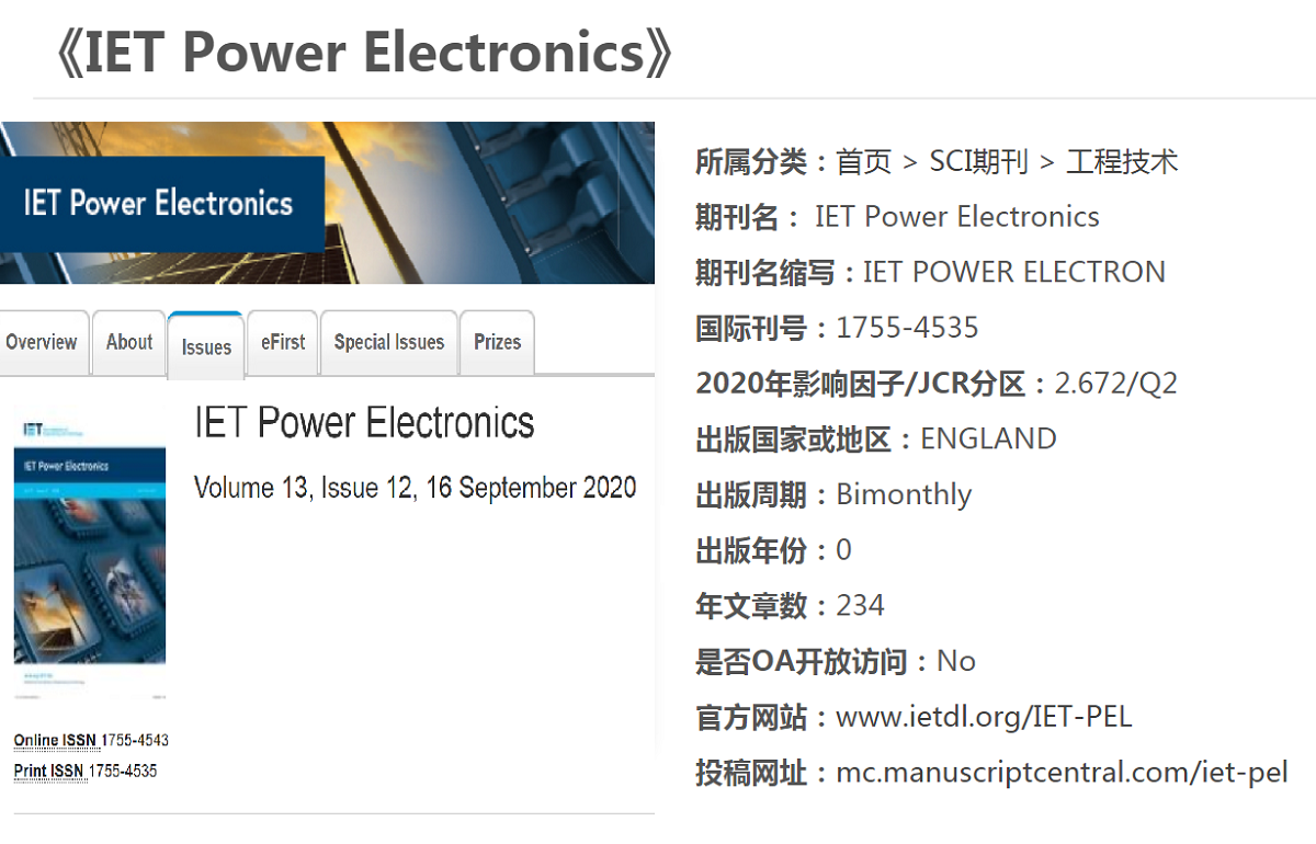 IET Power Electronics是英国工程技术学会(IET)的旗舰期刊,该期刊被SCI收录检索,JCR分区为2区,具有良好的声誉和广泛的学术影响力。IET Power Electronics重点发表电力电子、电力传动方向的高水平学术论文,是电气工程领域公认的国际著名学术期刊。