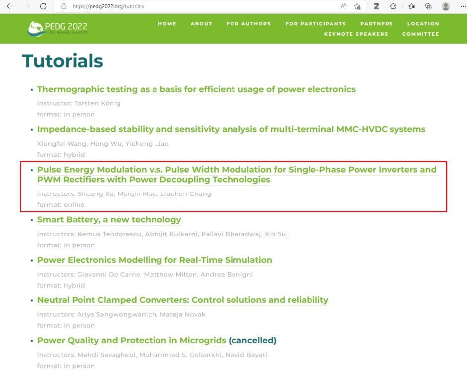 为第一单位,同加拿大皇家工程院院士张榴晨教授、合肥工业大学茆美琴教授一起,以“Pulse EnergyModulationv.s. Pulse Width Modulation for Single-Phase Inverters with Power Decoupling Technologies”为主题,做了时长为四个小时的线上特邀大会报告。