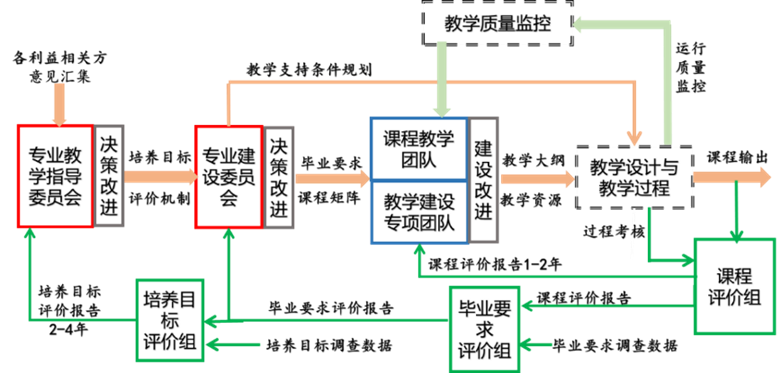 基于OBE的工程教育理念,贯彻以学生成长为中心,本专业将不同层次的持续改进机制落实到与学生成长发展密切相关的一系列环节中,包括培养目标制定、课程体系设计、毕业要求达成、课程教学活动设计、课程质量监控、课程质量评价、学生学习条件完善等等。专业以课程目标、毕业要求、培养目标的达成情况评价为抓手实现持续改进。